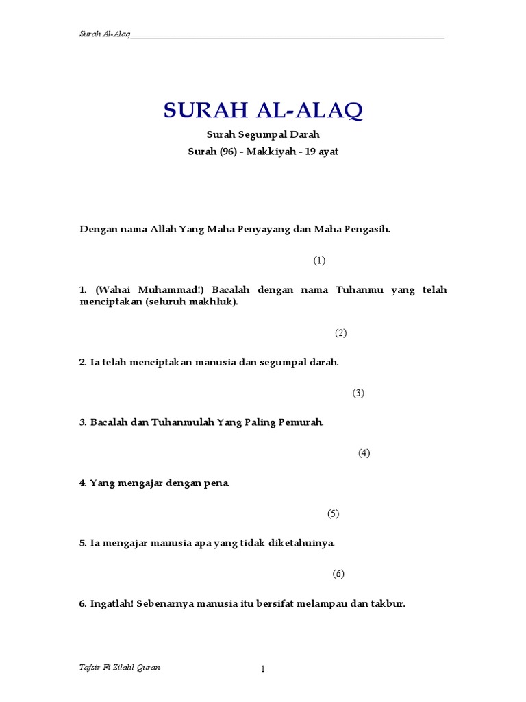 Tafsir Ringkas Kementrian Agama RI Surat Al-Alaq Ayat 1 Wahai nabi bacalah apa yang Allah wahyukan kepadamu dengan terlebih dahulu menyebut nama tuhanmu yang menciptakan segala sesuatu dengan keesaan-Nya. Surah ini mempunyai 19 ayat dan diturunkan di Makkah Ayat Makkiyyah. Bacalah dengan menyebut nama Tuhanmu yang menciptakan.